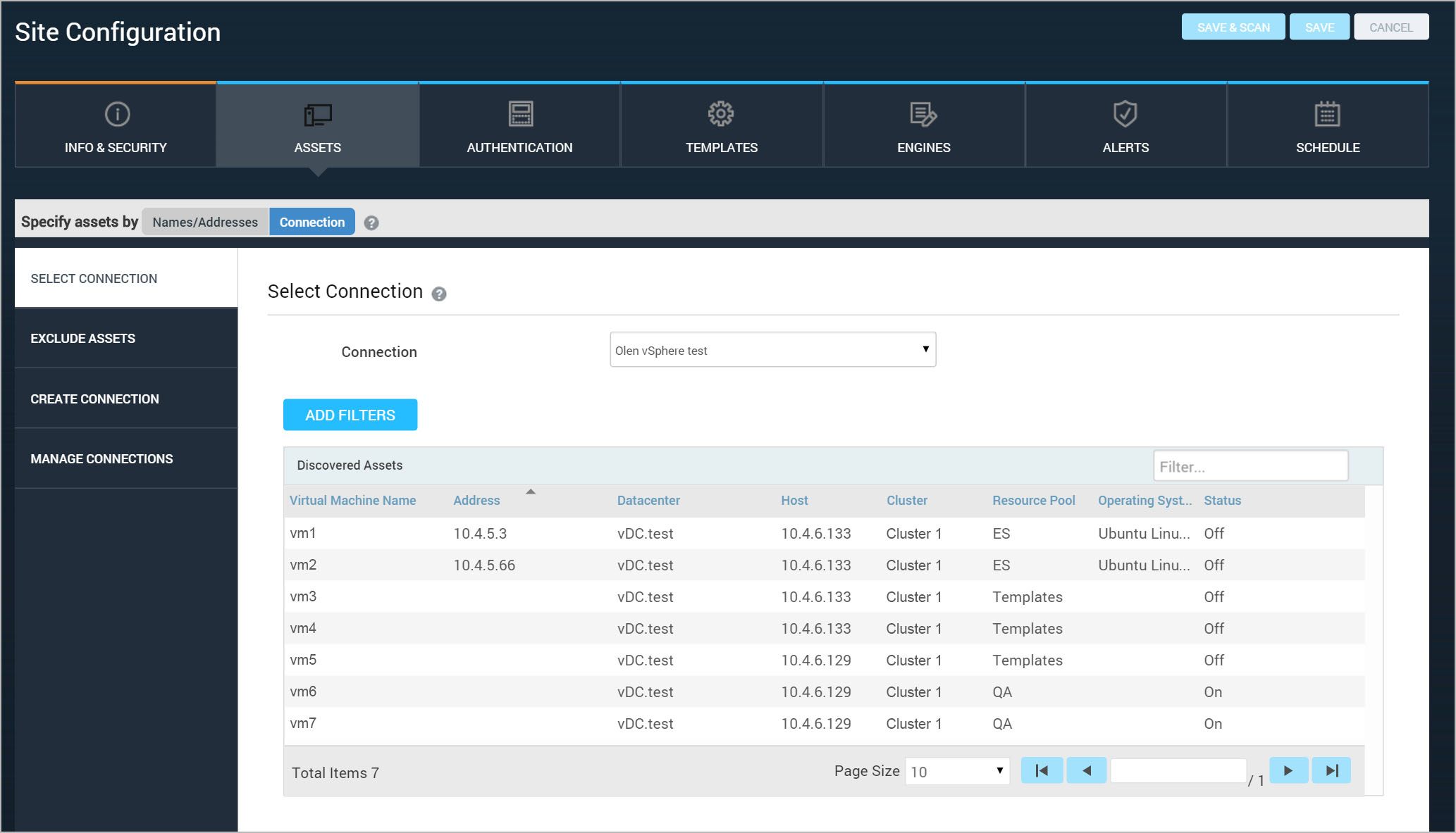 此操作包括让安全控制台联系服务器或API,并开始发现虚拟资产。在应用程序执行初始发现并返回已发现资产的列表之后,您可以基于标准筛选器对列表进行精炼,如下面的主题所述。要执行动态发现,您必须具有管理网站许可。看到配置角色和权限.