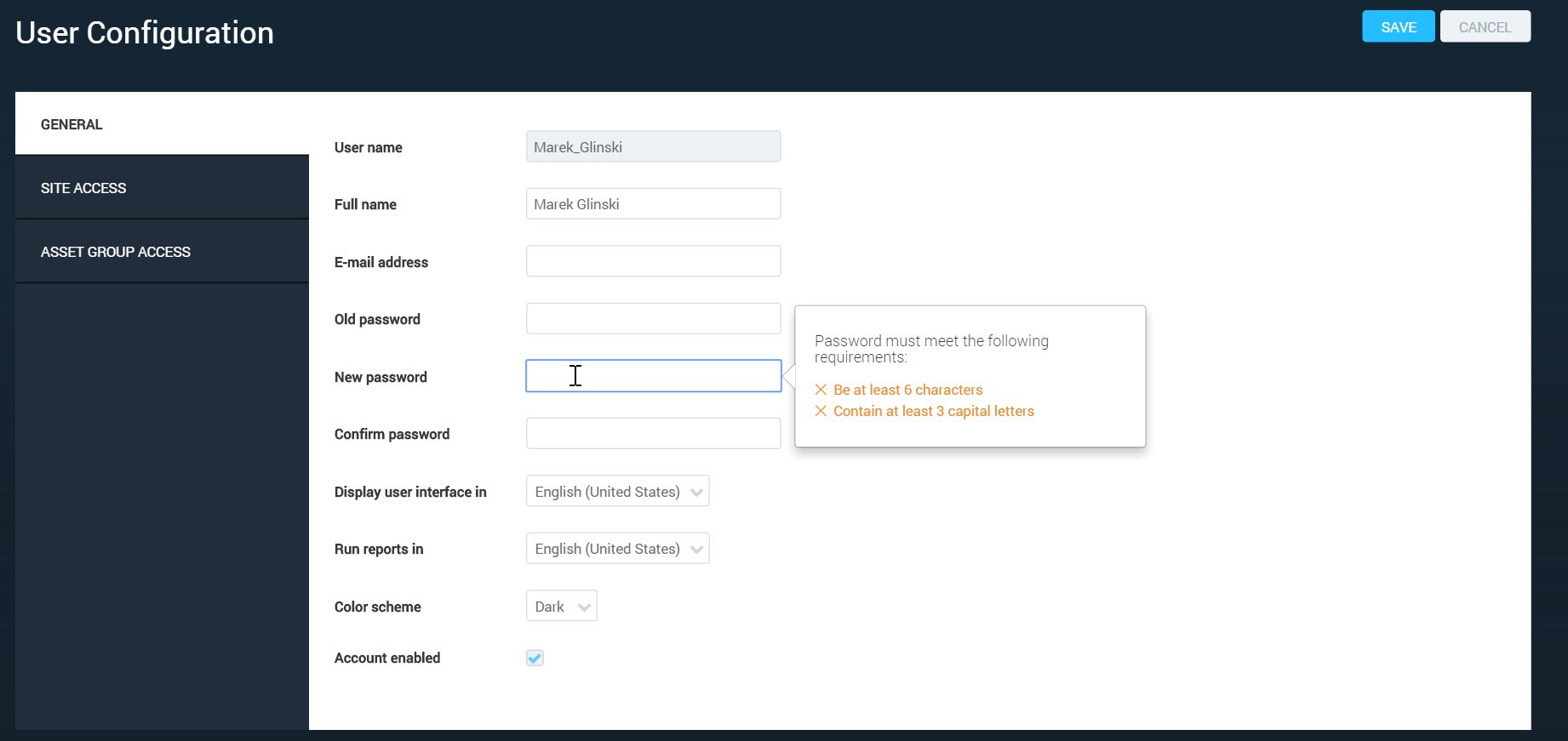 - 检查帐户启用复选框。您可以稍后通过再次单击复选框删除复选标记来禁用该帐户而不删除它。