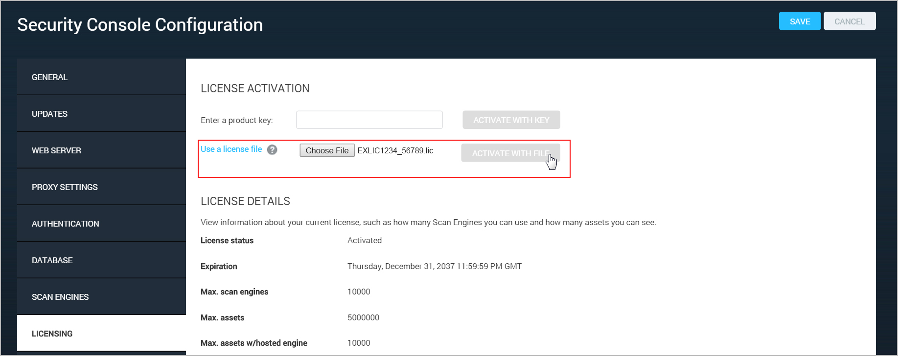 如果您的安全控制台无法访问Internet或updates.rapid7.com服务器,您可以使用一个许可证文件激活您的许可证。由客户管理团队提供给您,这个文件有一个.lic扩展,并列出与您的许可证可用的所有功能和扫描能力。