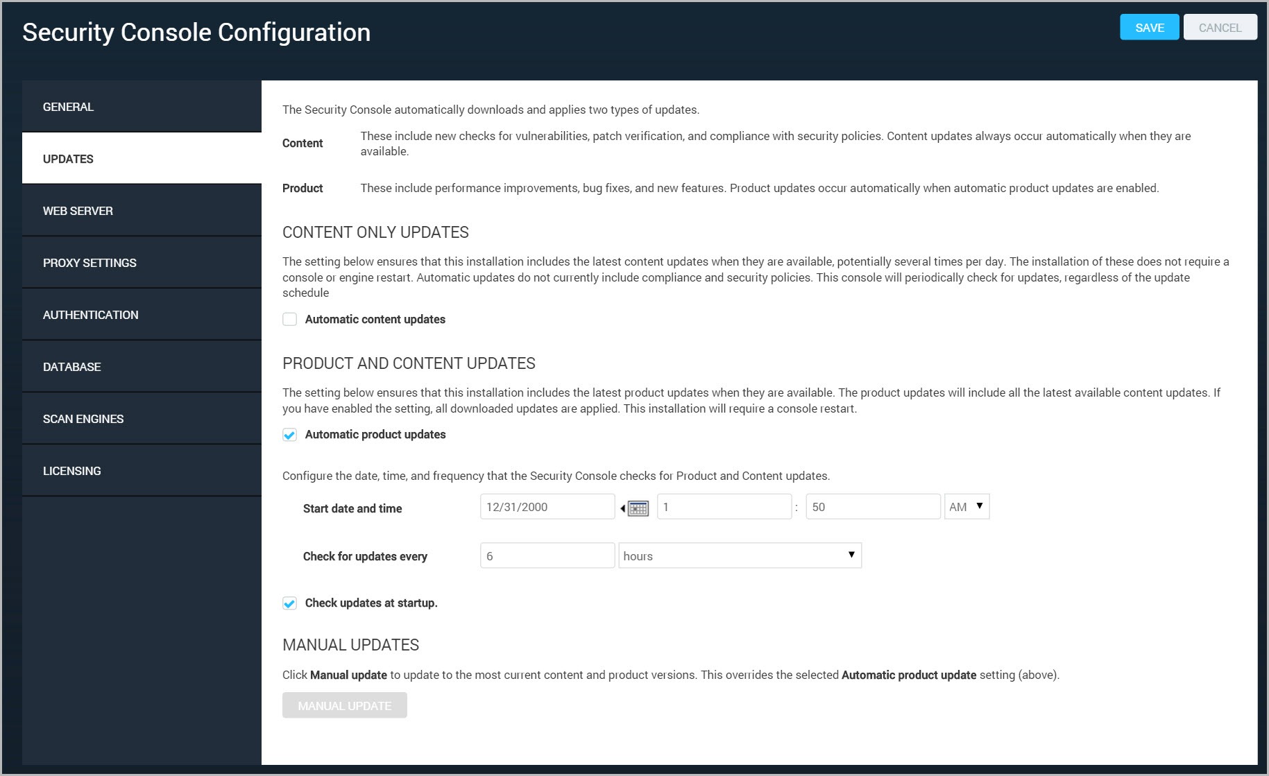 内容更新包括漏洞,修补程序验证和安全策略合规性的新检查。内容更新始终在可用时自动发生。但是,可以禁用自动内容更新安全控制台配置并在您选择的时间安排它们。