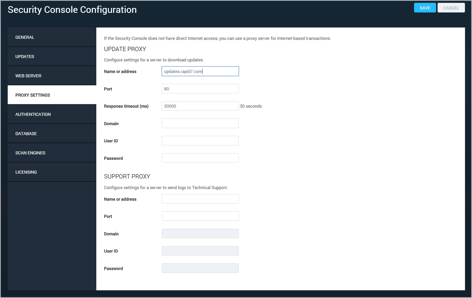 - 这姓名或地址字段设置为更新.rapid7.com默认情况下,这意味着安全控制台被配置为直接与升级服务器联系。如果需要使用代理,请输入代理服务器的名称或IP地址。