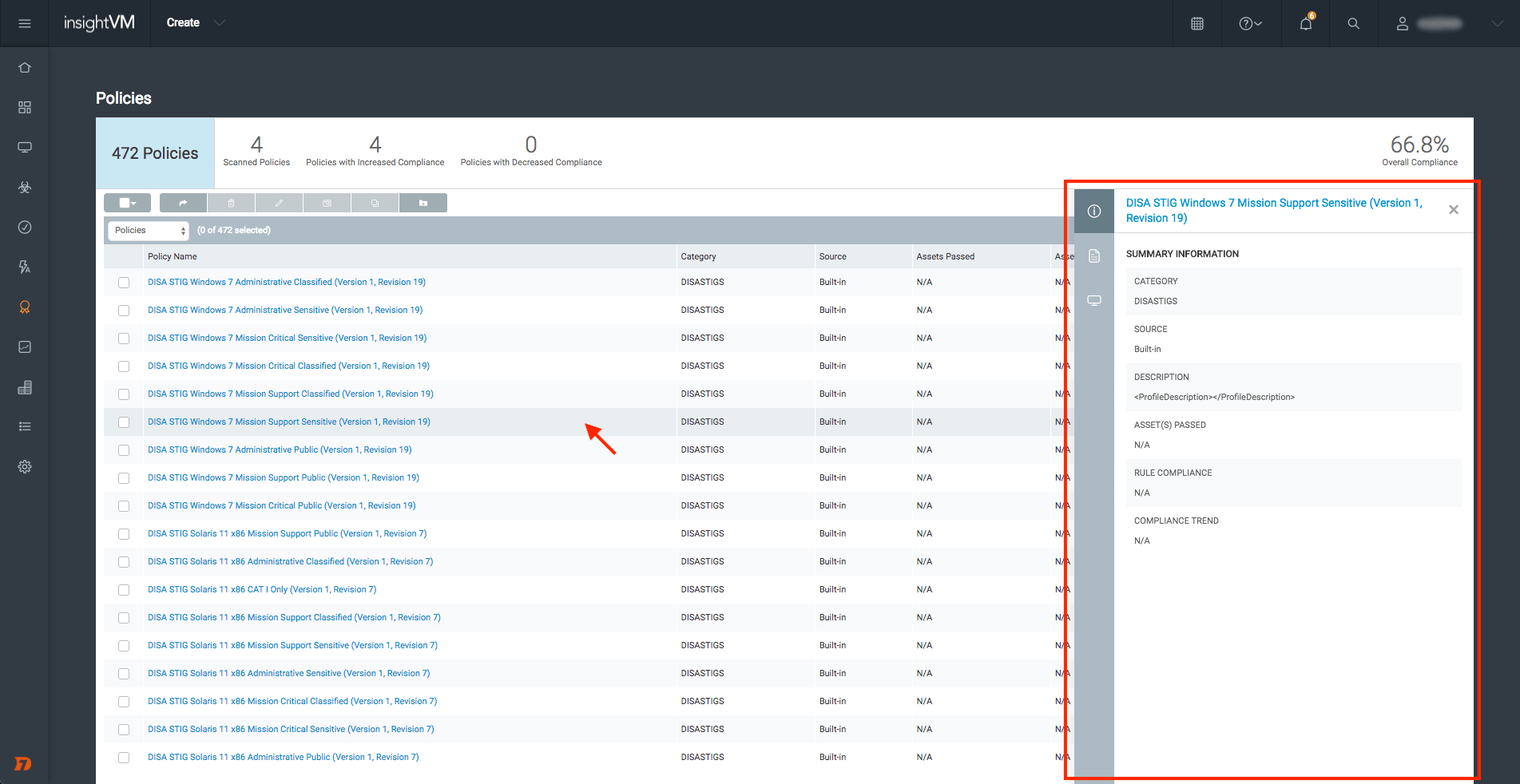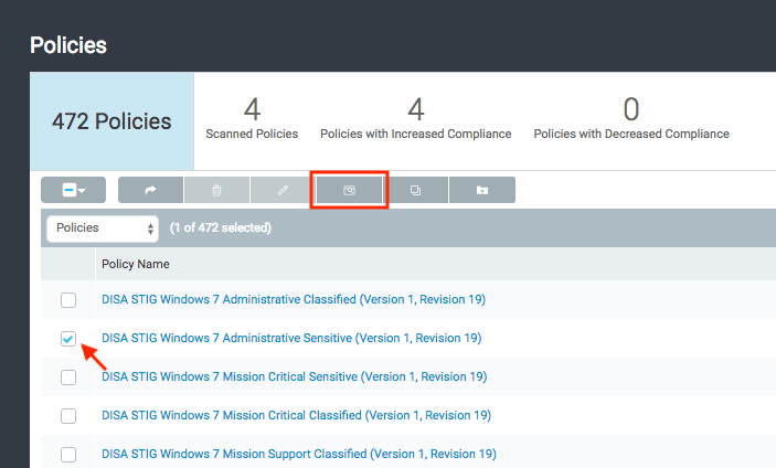 - 的扫描的资产选项卡也可在选择各个策略组和规则时可用。