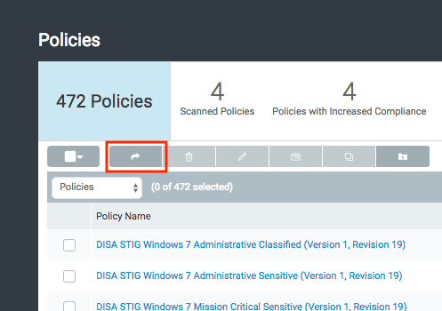 点击政策在安全控制台菜单上的选项卡。“策略”页面包含基于您的访问级别的策略表以及以下度量标准:
