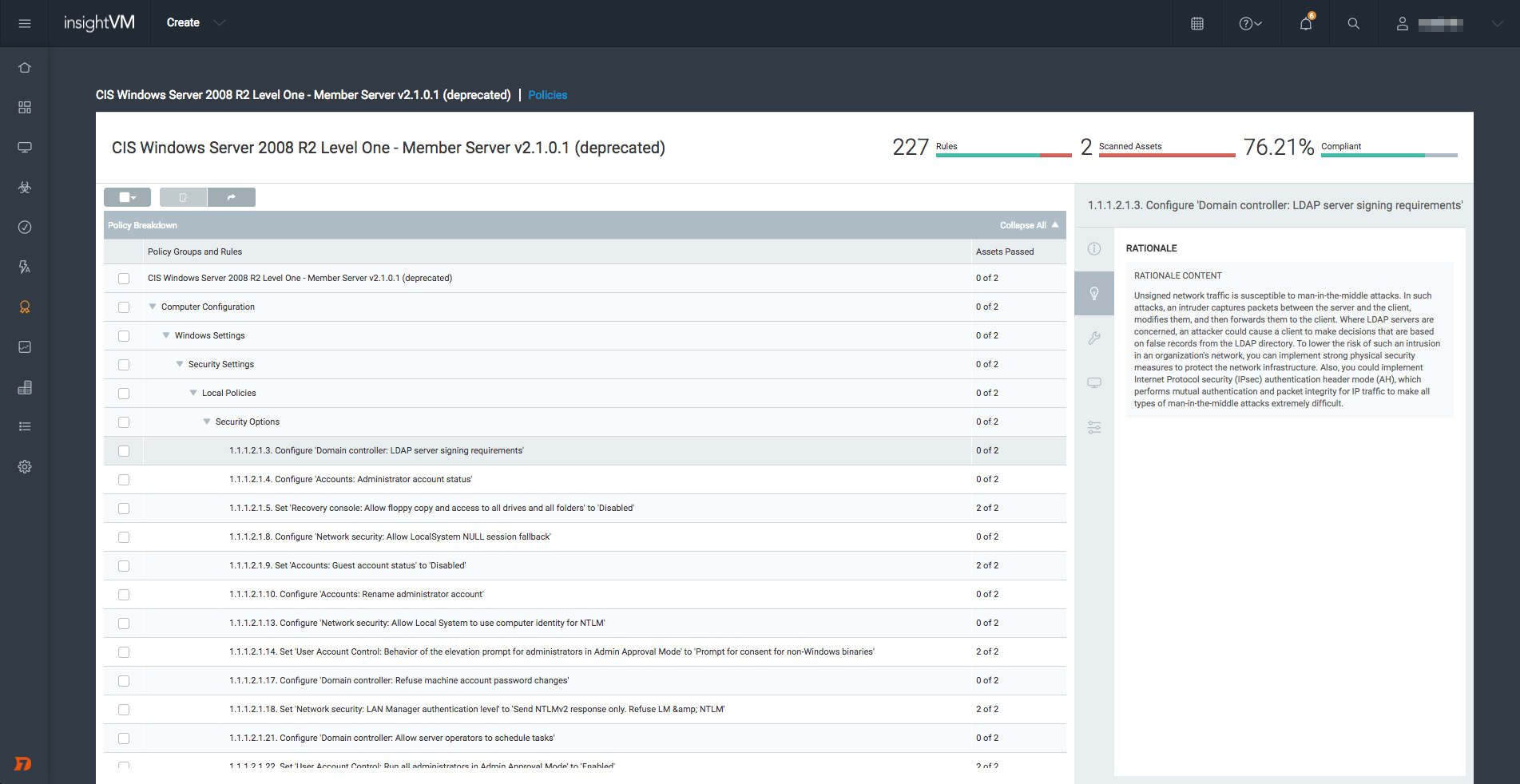 - 扫描的资产- 此选项卡显示规则的扫描资产,每个资产的操作系统以及资产是否通过或失败。